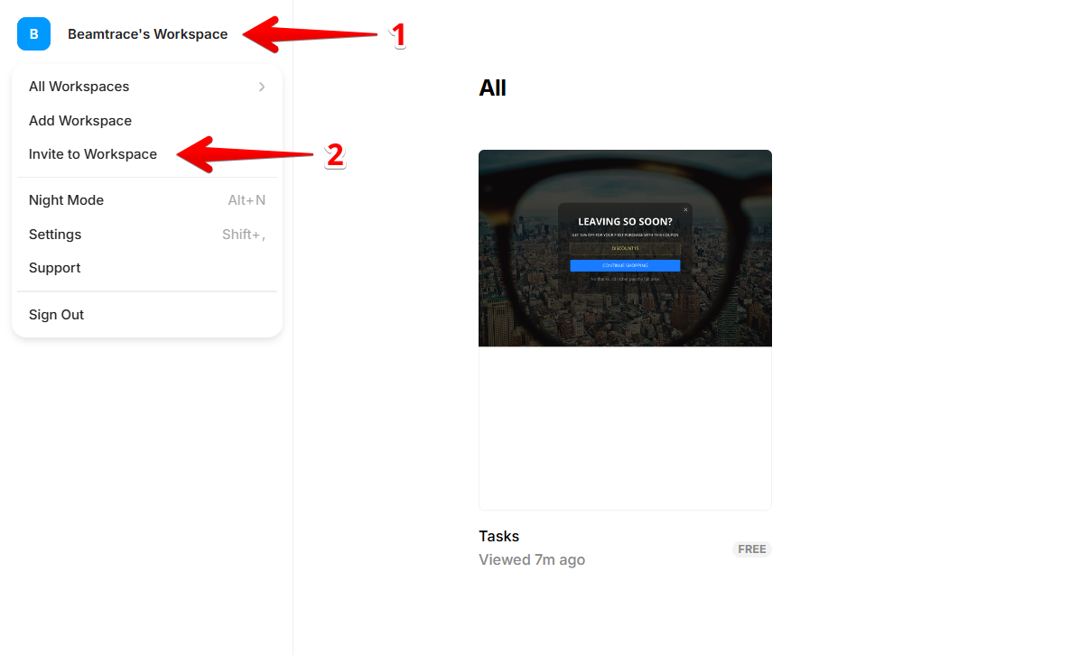 Open your Framer dashboard, click on your workspace in the top-left corner, and select the Invite to Workspace option: