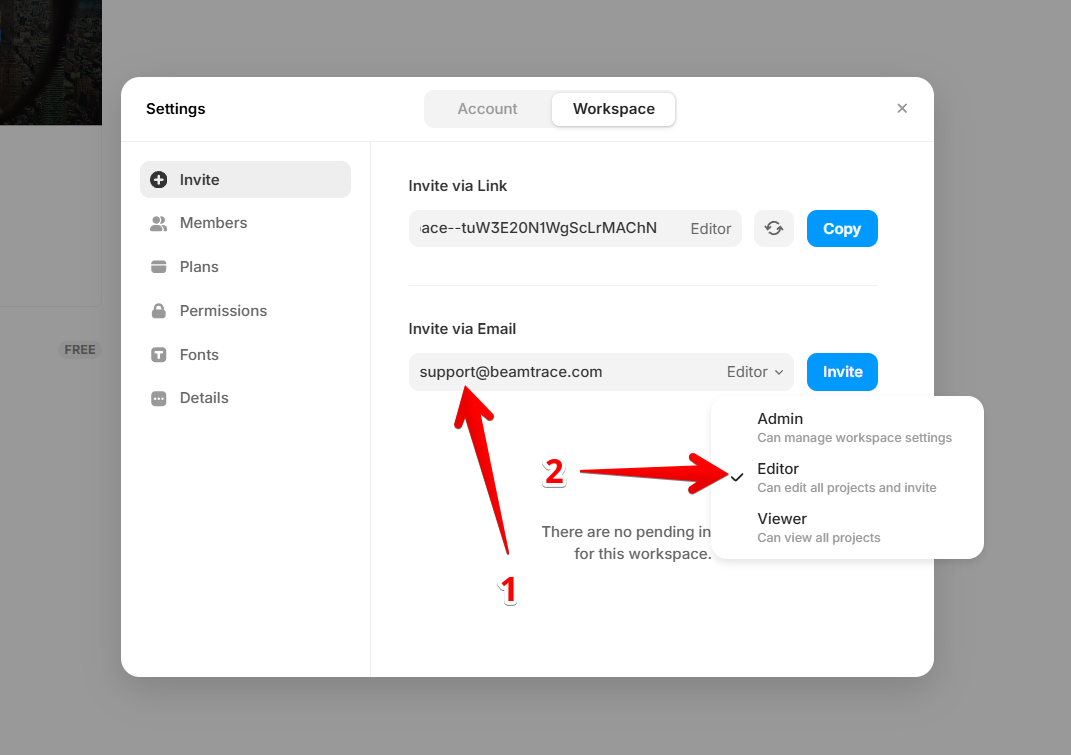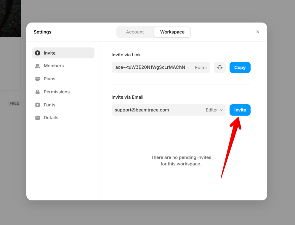 Click Invite to email us an invitation and give us access to your workspace: